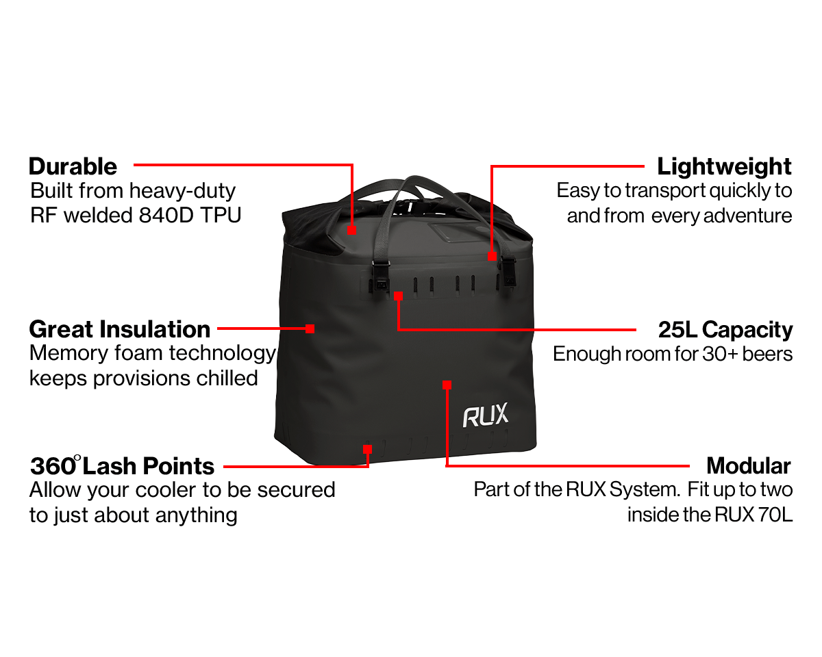 - Integrate: Compatible with the RUX system, fitting neatly in the RUX 70L, or attaching via RUX Buckles to the 70L external Utility Rails.