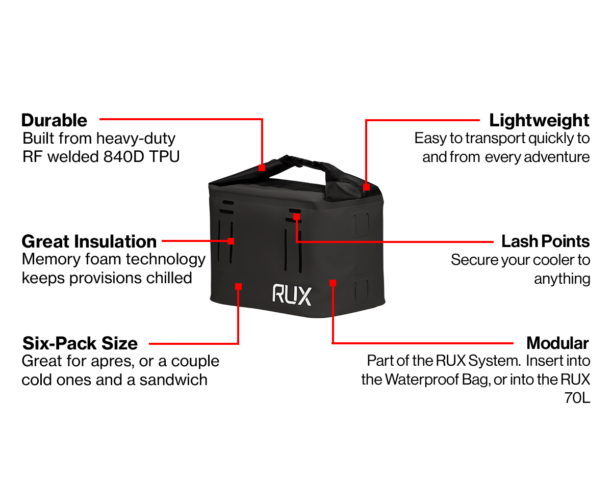 Great for an après six-pack. Or a couple cold ones and a sandwich. As long as you require an ice-cold drink, the RUX Cooler Cube is perfect for you. Built from heavy-duty RF welded 840D TPU, the Cube is ready for anything you can throw at it. Multiple lash points allow for a variety of tie down possibilities, and also enable the use of the RUX Waterproof Bag or RUX Cooler Bag shoulder strap.