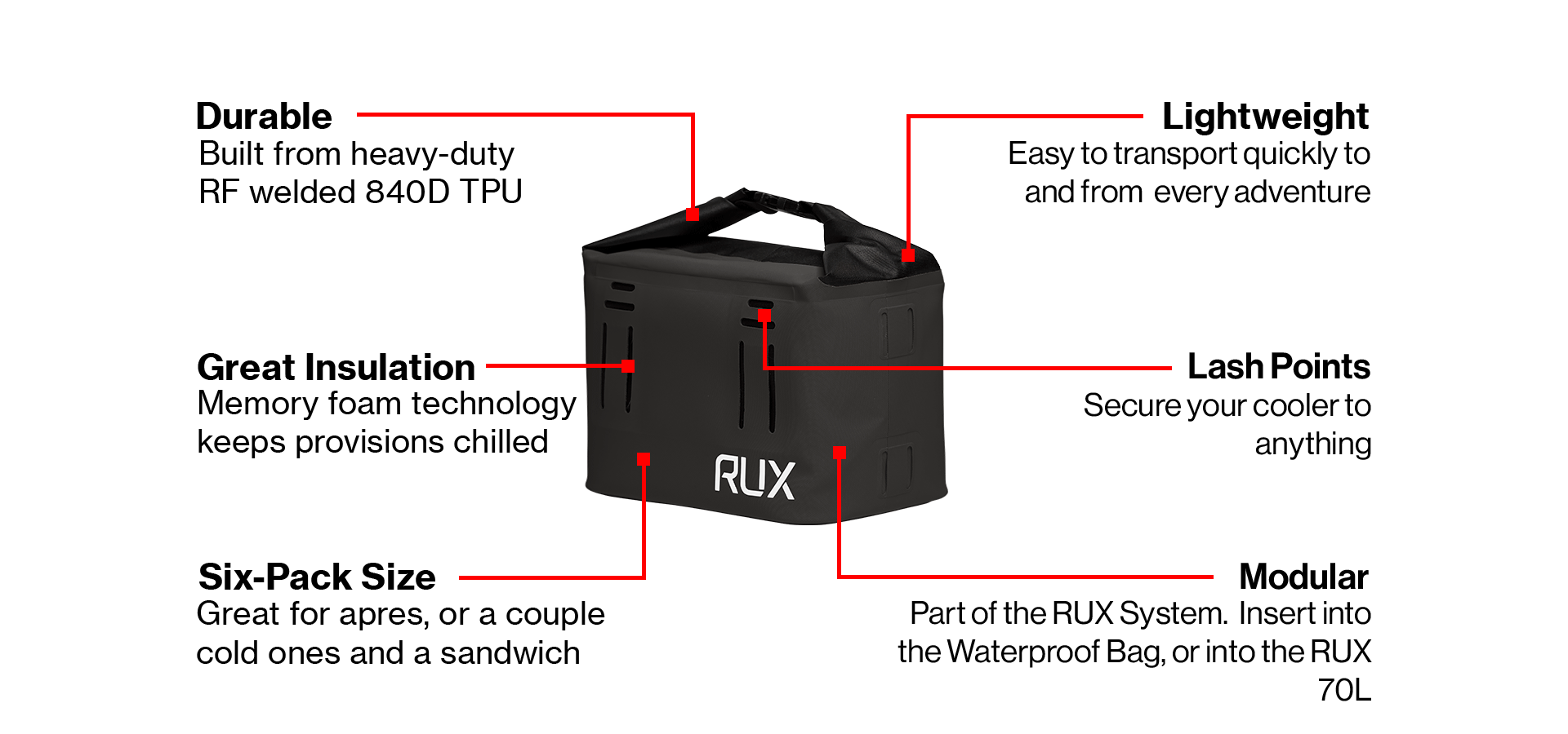 Great for an après six-pack. Or a couple cold ones and a sandwich. As long as you require an ice-cold drink, the RUX Cooler Cube is perfect for you. Built from heavy-duty RF welded 840D TPU, the Cube is ready for anything you can throw at it. Multiple lash points allow for a variety of tie down possibilities, and also enable the use of the RUX Waterproof Bag or RUX Cooler Bag shoulder strap.