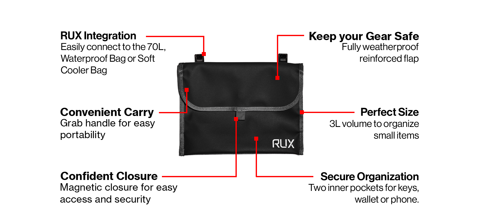 Weather resistant 3L pocket to conveniently organize small items. Connect it to your RUX 70L or Waterproof Bag, or grab it on its own and go. Super convenient for everyday carry or travel.