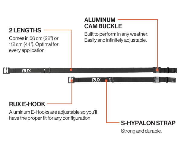 Offered in two different lengths these durable laser-cut S-Hypalon straps are infinitely adjustable and the aluminum RUX E-Hooks ensure you’ll have the proper fit for any platform configuration and mode of transportation.