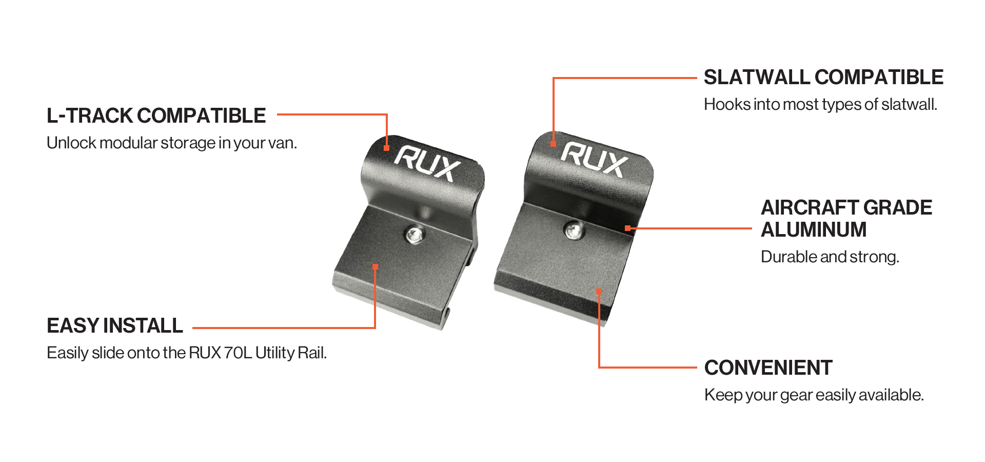 Make your RUX 70L slatwall or L-Track compatible! Enjoy fast modular storage for your home, garage, van, truck, shop, or wherever else you have slatwall or L-tracks installed.