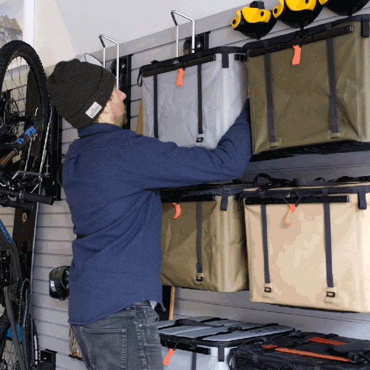 Hooks into most types of slatwall, so you can easily store your RUX 70L where it's easy to access.
