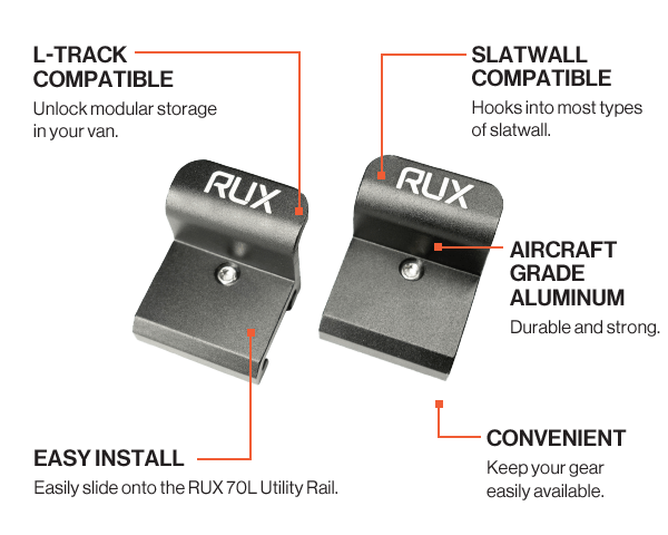 RUX Utility Hooks allo you to easily connect your RUX 70L to slatwall or L-Track systems, providing fast and modular storage solutions for your home, garage, van, truck, shop, or any other space equipped with these systems.