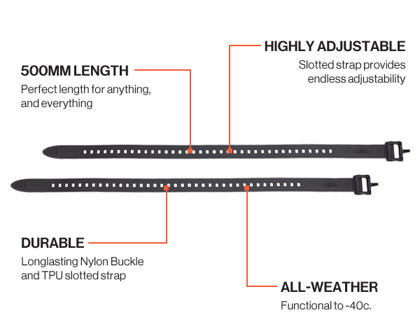 Our Utility Straps slot seemlessly through the many lash points on our Waterproof Bags as well as the Utility Rails on our RUX 70L. Easily secure your gear and go.